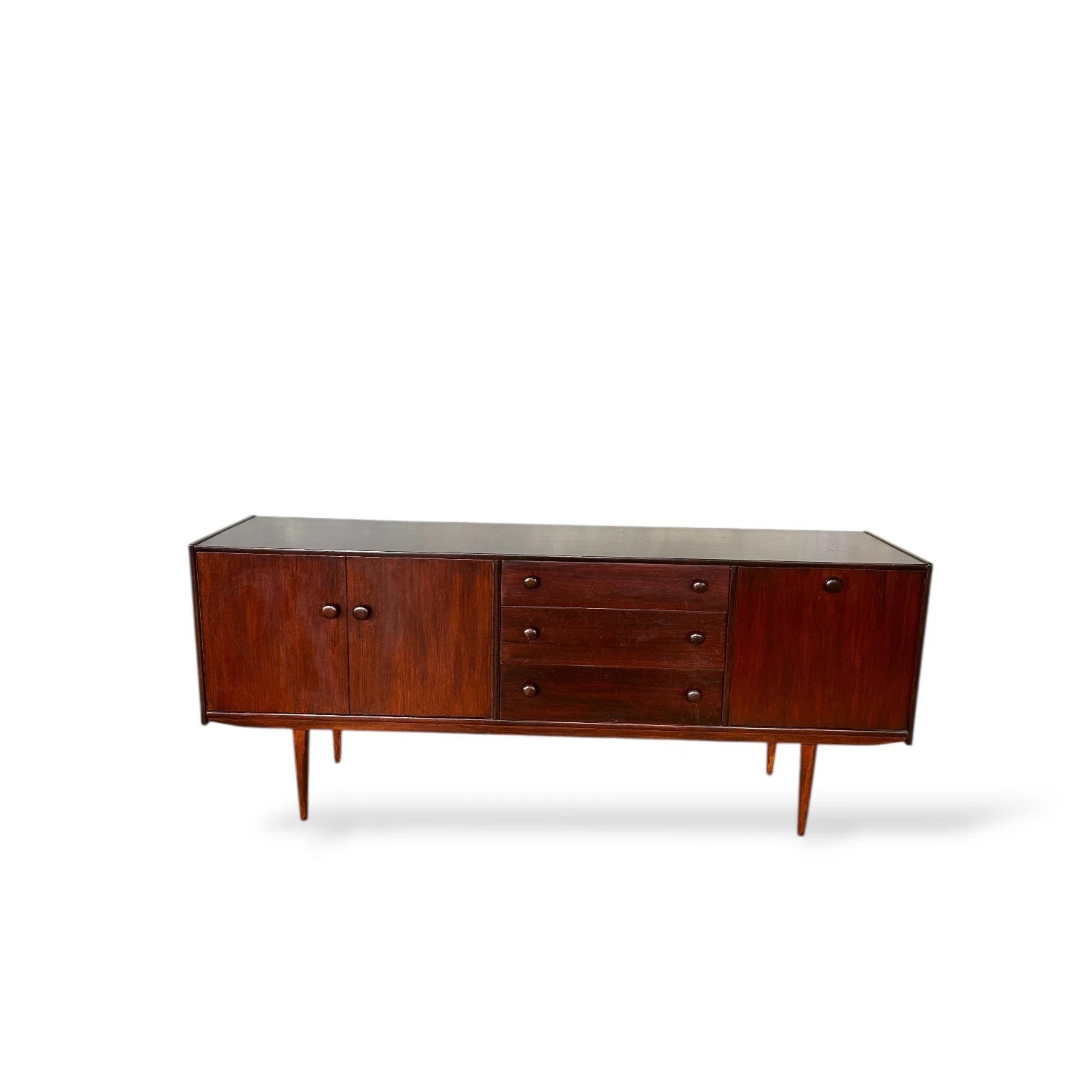 A striking mid century rosewood effect sideboard, dating from the 1960s/70s. With its clean modernist lines and richly toned finish, this piece adds both function and elegance to any interior. The sideboard features: • Two spacious cupboards with shelved interiors, ideal for tableware or storage. • A central bank of four drawers, perfect for cutlery, linens, or smaller items. • Original round wooden handles and elegant tapered legs. This versatile credenza works beautifully in a living room, dining room, or hallway, offering generous storage while doubling as a stylish surface for display. Its rosewood-effect finish gives the look of classic Danish modern design at a more accessible price point. ⸻ Dimensions • Width: 181 cm • Height: 77 cm • Depth: 45 cm ⸻ Condition Good vintage condition with some light age-related wear consistent with use. Sturdy and ready to use.