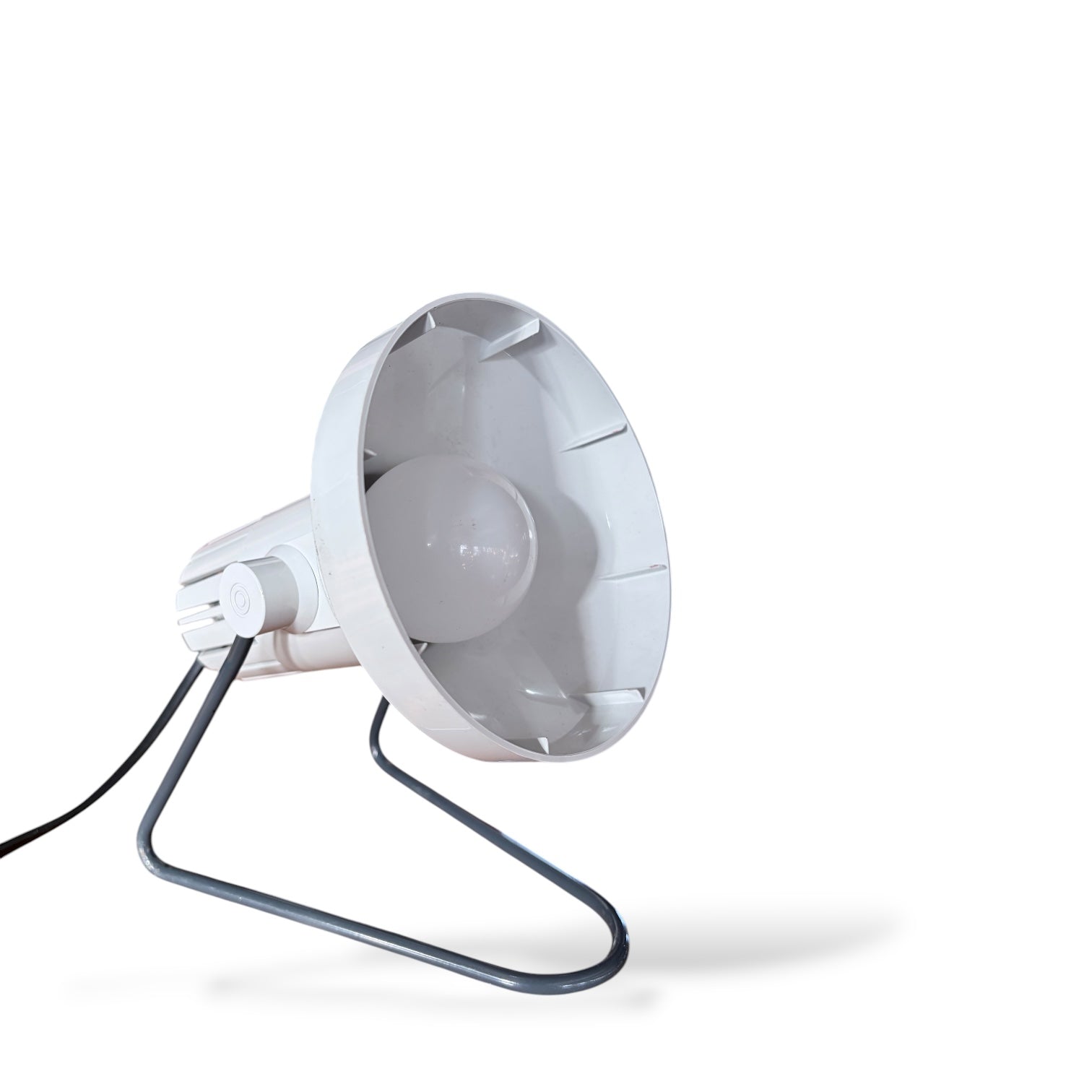 Dimensions include a height of 26 cm, width of 25 cm, and depth of 28 cm, fitting comfortably on desks or floors without overwhelming your space. The large circular switch and ridged rear casing emphasize its industrial style lighting roots, while the white and grey color palette complements minimalist or modern interiors. This 1970s floor lamp is in excellent vintage condition, fully working and PAT tested for safety.
