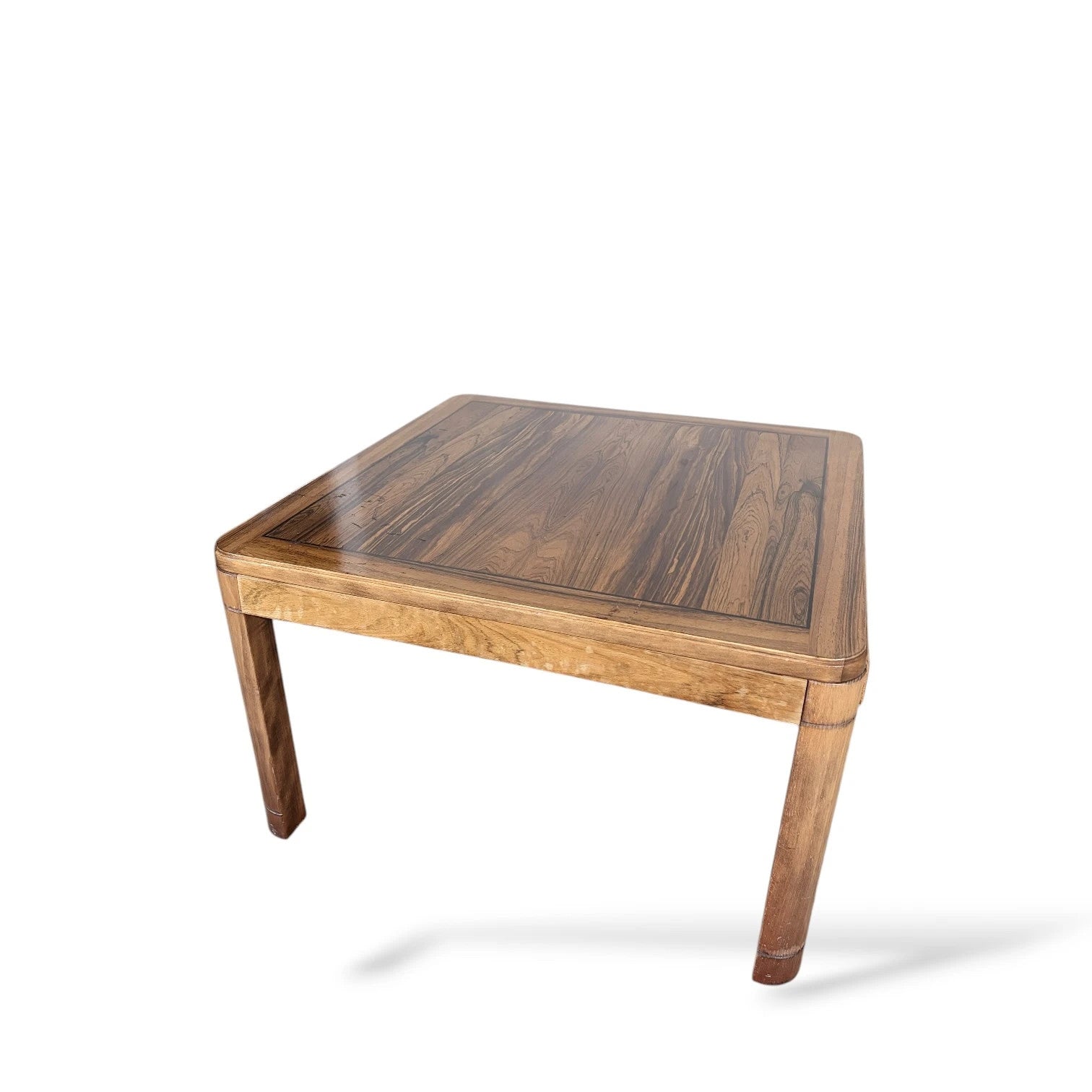 A striking rosewood coffee table by Ulferts of Sweden, crafted circa 1970. This beautifully proportioned square table showcases the rich natural grain of rosewood, with a stunning bookmatched top framed by softly rounded edges and tapered solid wood legs. The craftsmanship is typically Scandinavian — elegant, functional, and timeless. Its minimalist form and warm tone make it the perfect centrepiece for modernist, mid-century, or contemporary interiors. Details • Maker: Ulferts of Sweden • Origin: Sweden • Date: 1970s • Style: Scandinavian Modern / Mid-Century Modern • Materials: Rosewood veneer and solid wood base • Colour: Warm rosewood tones with natural grain variations • Condition: Excellent vintage condition with minor surface wear consistent with age; professionally cleaned and polished. Dimensions • Width: 75 cm • Depth: 75 cm • Height: 50 cm Features • Classic Scandinavian design • Beautiful rosewood grain and tone • Rounded edges and tapered legs • Timeless and versatile form