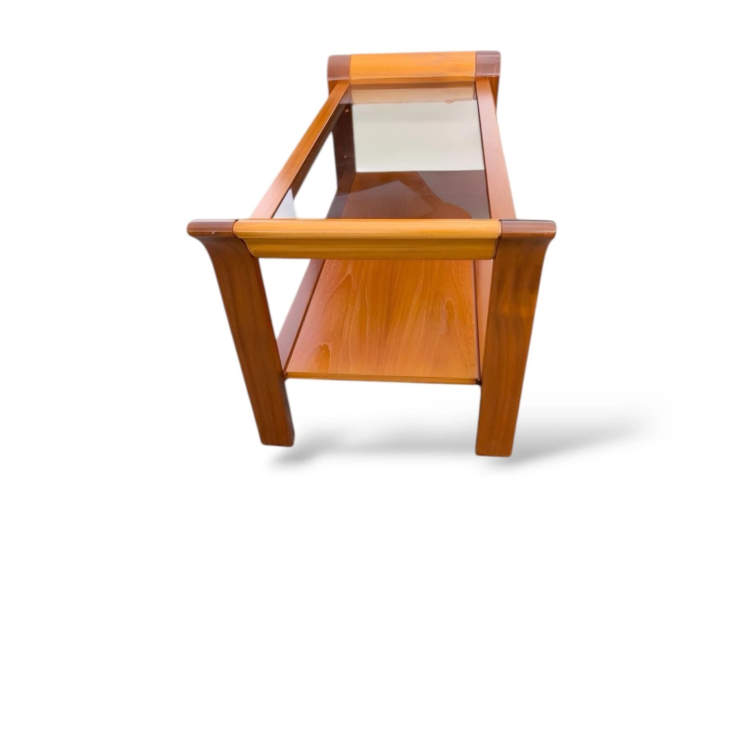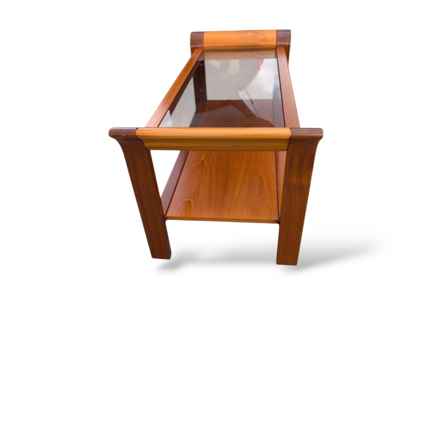 A refined Nathan smoked glass coffee table, crafted in the mid-20th century with signature British modernist elegance. The design features gently curved teak ends, a smoked glass top, and a practical lower shelf for display or storage. The contrasting tones and sweeping lines showcase Nathan’s reputation for craftsmanship and timeless form. Perfectly balanced between utility and design sophistication, this piece makes a stylish addition to any mid-century or contemporary interior. ⸻ Details • Maker: Nathan Furniture • Era: Mid-20th Century • Origin: United Kingdom • Material: Teak, smoked glass • Condition: Good vintage condition with minor age-related wear consistent with use • Features: Curved teak ends, smoked glass top, lower shelf ⸻ Dimensions • Width: 113 cm • Depth: 49 cm • Height: 50 cm ⸻ Styling Notes A classic British modernist design — elegant yet practical. Ideal as a living room centrepiece, display surface, or occasional table alongside other teak or rosewood pieces. ⸻ Delivery & Collection • UK delivery available – please enquire for a quote • Collection welcome from West Yorkshire • Explore more mid-century design at variusvintage