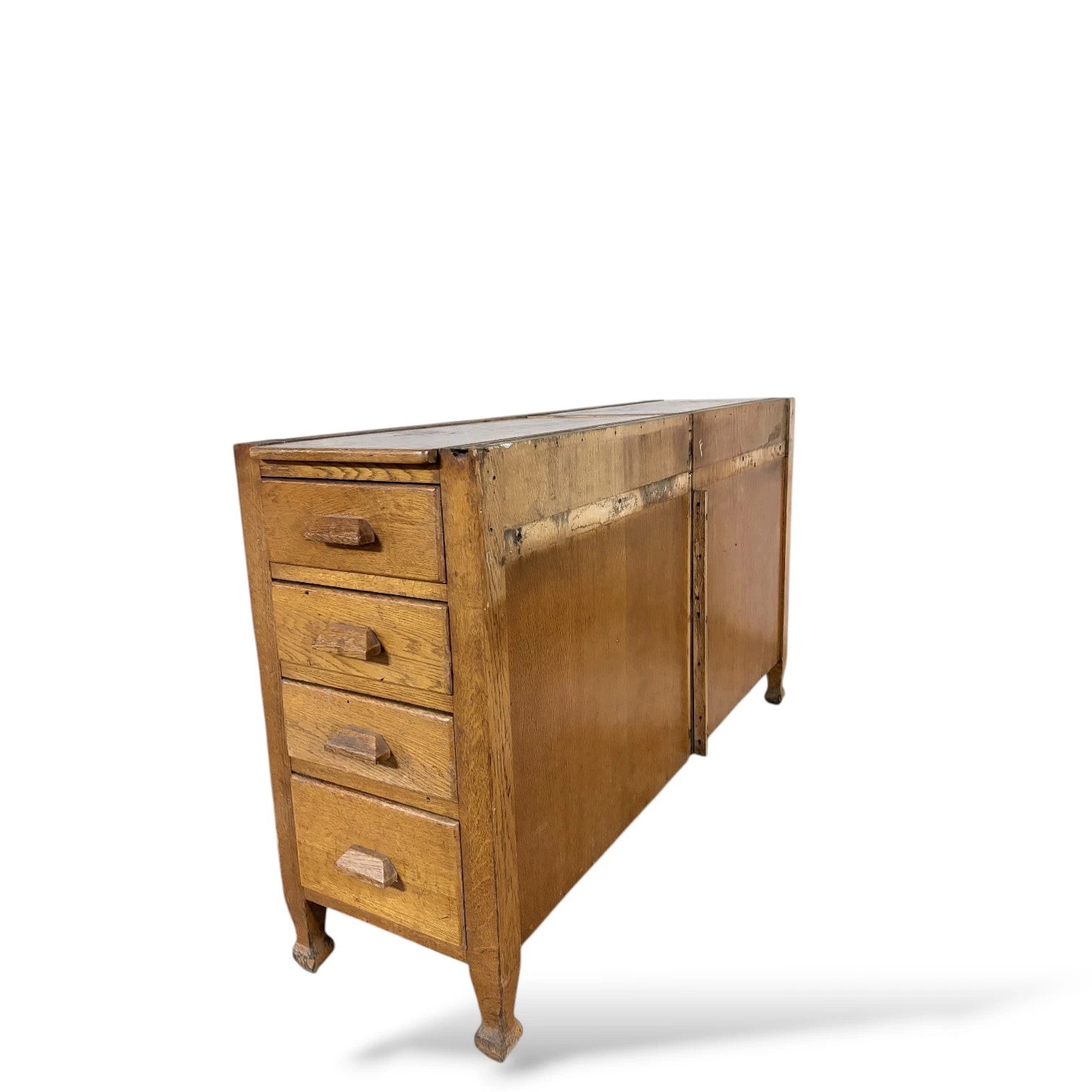 A rare oak partner’s desk base featuring twin sets of drawers on both sides, offering substantial and symmetrical storage. Crafted in solid oak with dovetail joints, geometric wooden handles, and shaped feet, this piece showcases the durability and balance typical of early 20th-century office furniture.
