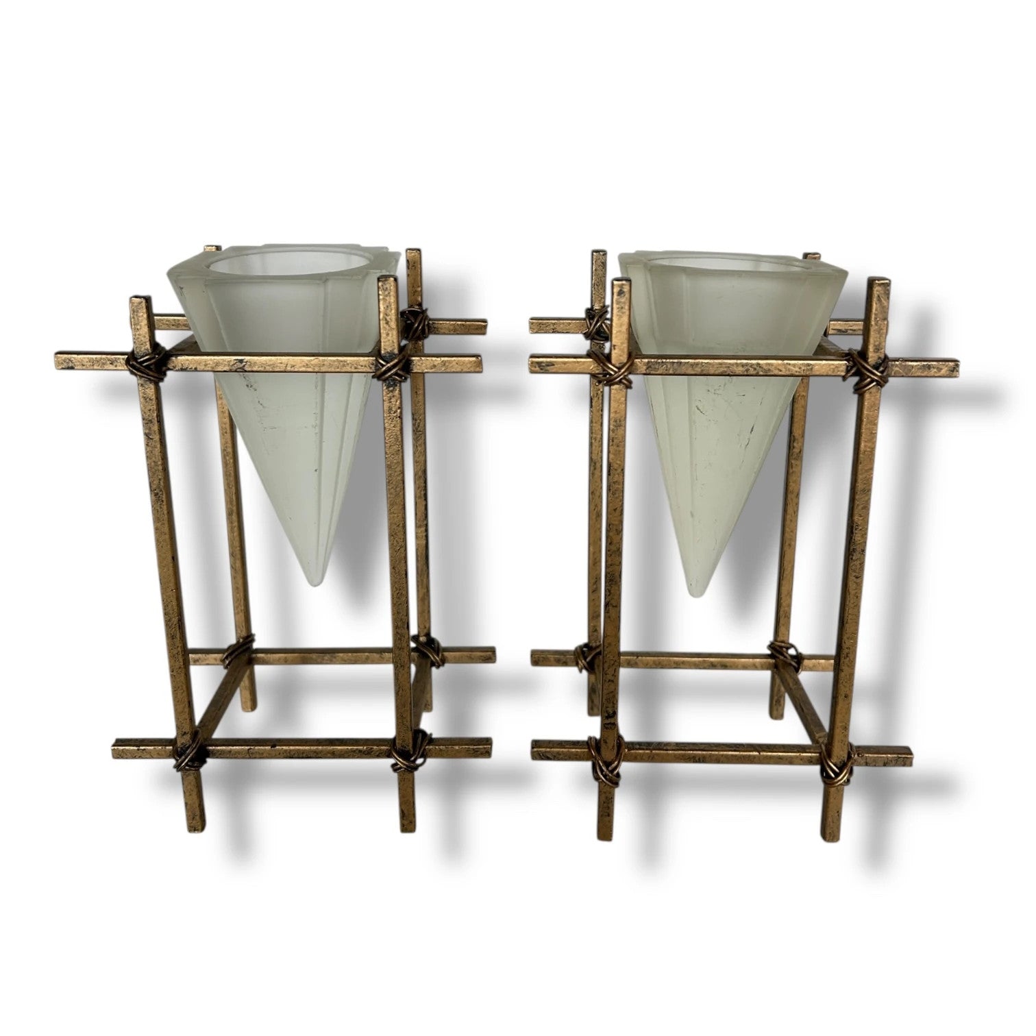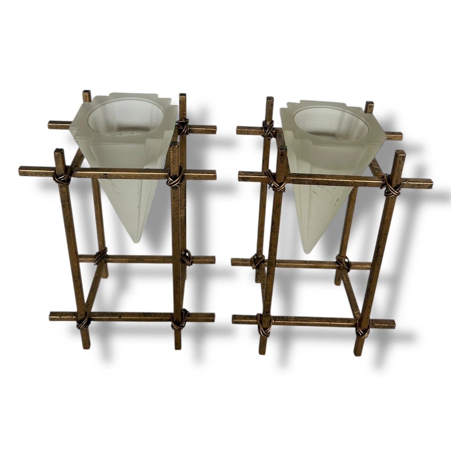 Pair of French Brass & Frosted Glass Candle Holders – Mid Century Modern Geometric Votive Stands