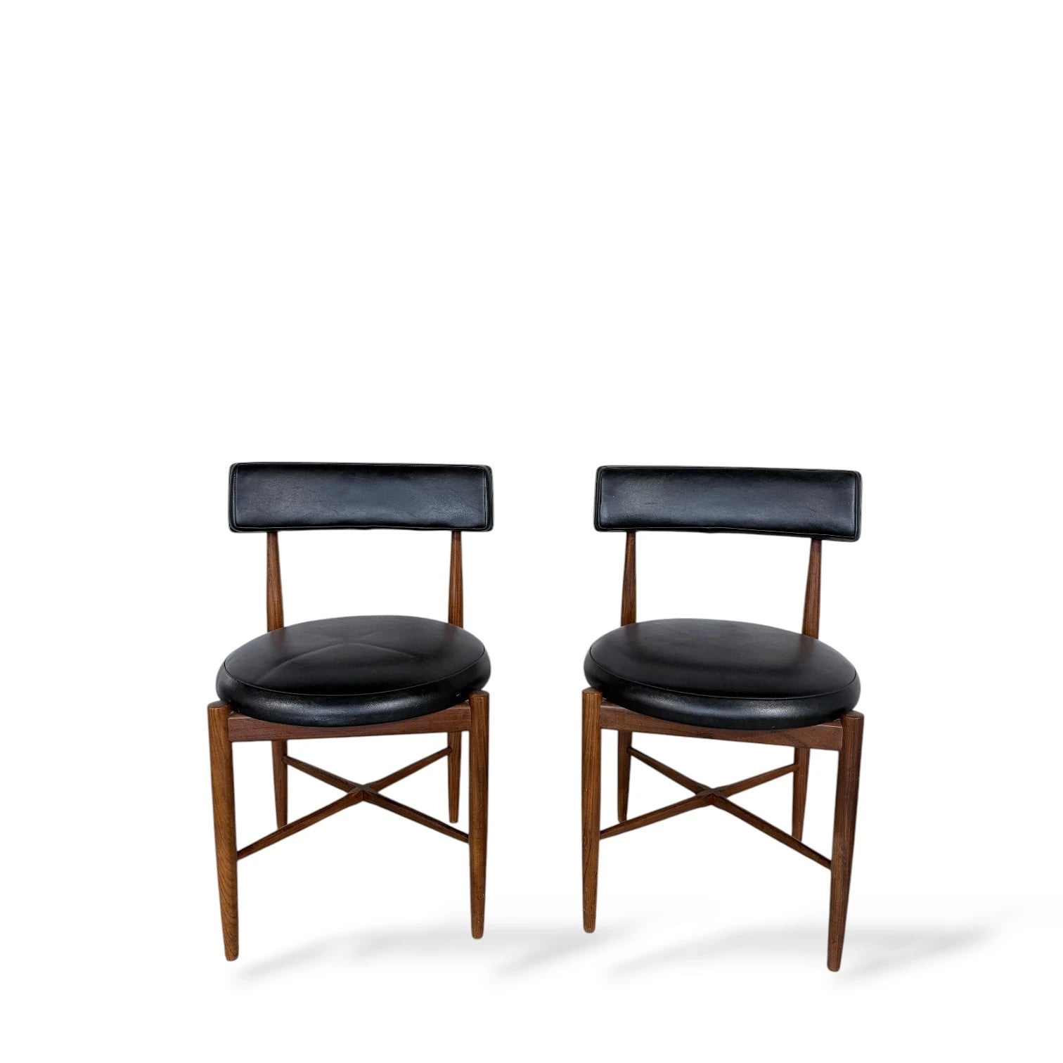 Pair of G Plan Afromosia Teak Dining Chairs – Black Vinyl Seats, 1960s Mid-Century Modern