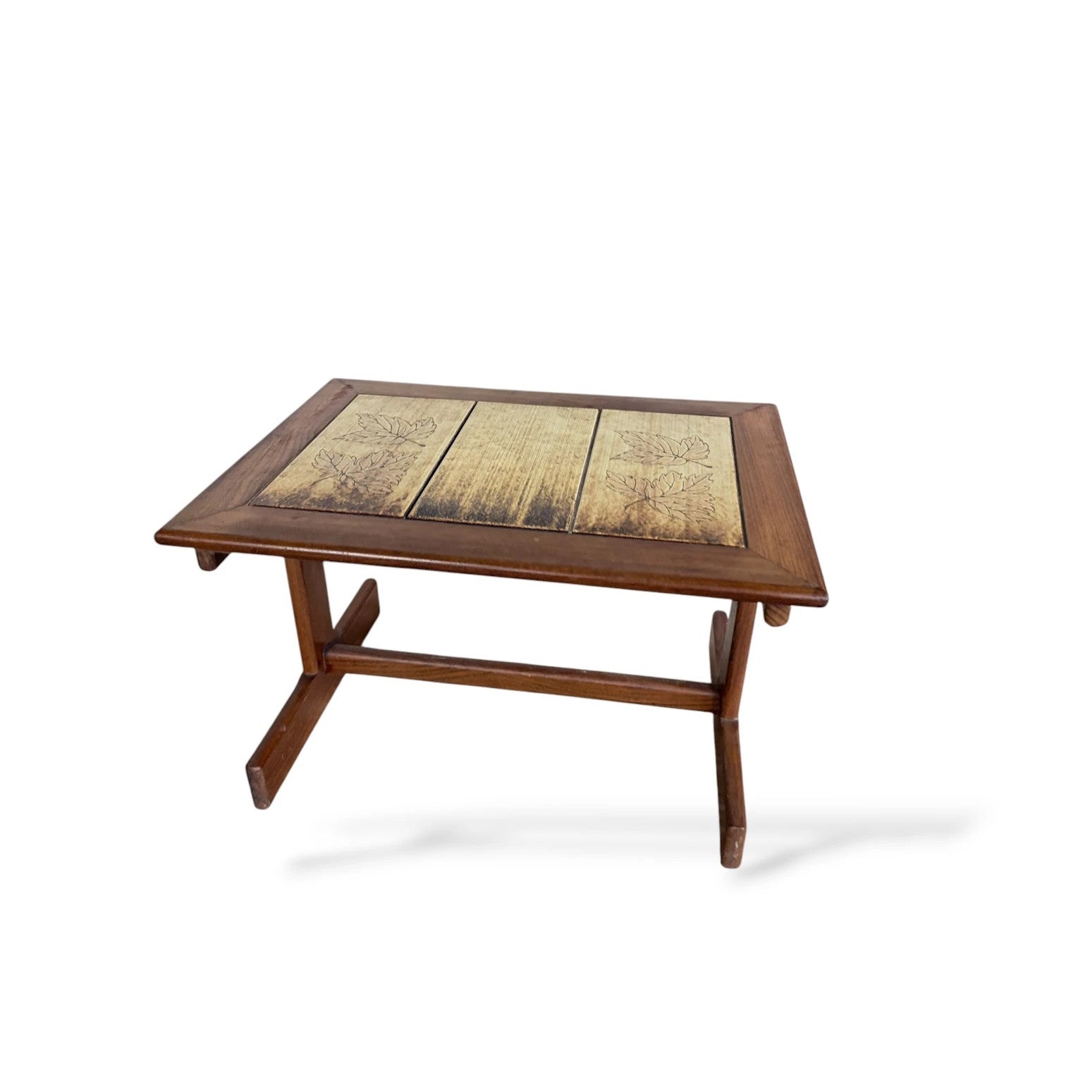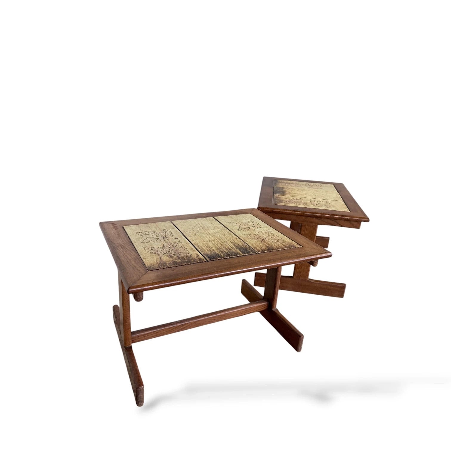 beautiful matching pair of Mid-Century Modern teak and tile side tables, circa 1960s. Each table features a solid teak frame with a distinctive sledge-style base and a tiled top decorated with softly glazed leaf motifs in neutral earthy tones. These tables are both stylish and functional, ideal for use as bedside tables, end tables, or lamp stands. The combination of teak and ceramic tile gives them durability as well as visual warmth — perfect for Scandinavian-inspired or retro interiors. Details • Date: 1960s • Style: Mid-Century Modern / Scandinavian Modern • Materials: Solid teak, ceramic tiles • Colour: Warm brown teak with beige and brown glazed tiles • Condition: Excellent vintage condition with light age-related wear; structurally sound and ready for use. Dimensions (each) • Width: 58 cm • Depth: 43 cm • Height: 40 cm Features • Matching pair • Teak sledge-base frames • Ceramic tiled tops with botanical leaf detail • Durable and heat-resistant surfaces • Ideal as side or bedside tables
