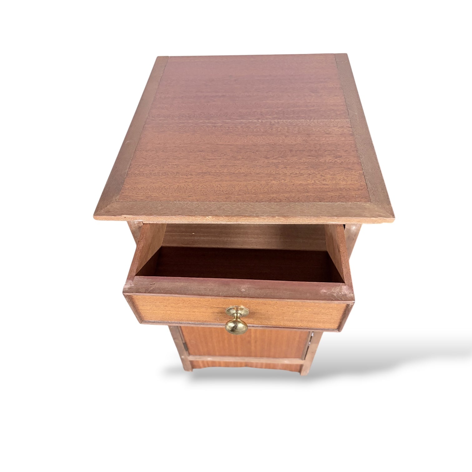 A pair of vintage teak and mahogany bedside cabinets, each with a single drawer and cupboard door, featuring brass knobs and clean, functional lines.
