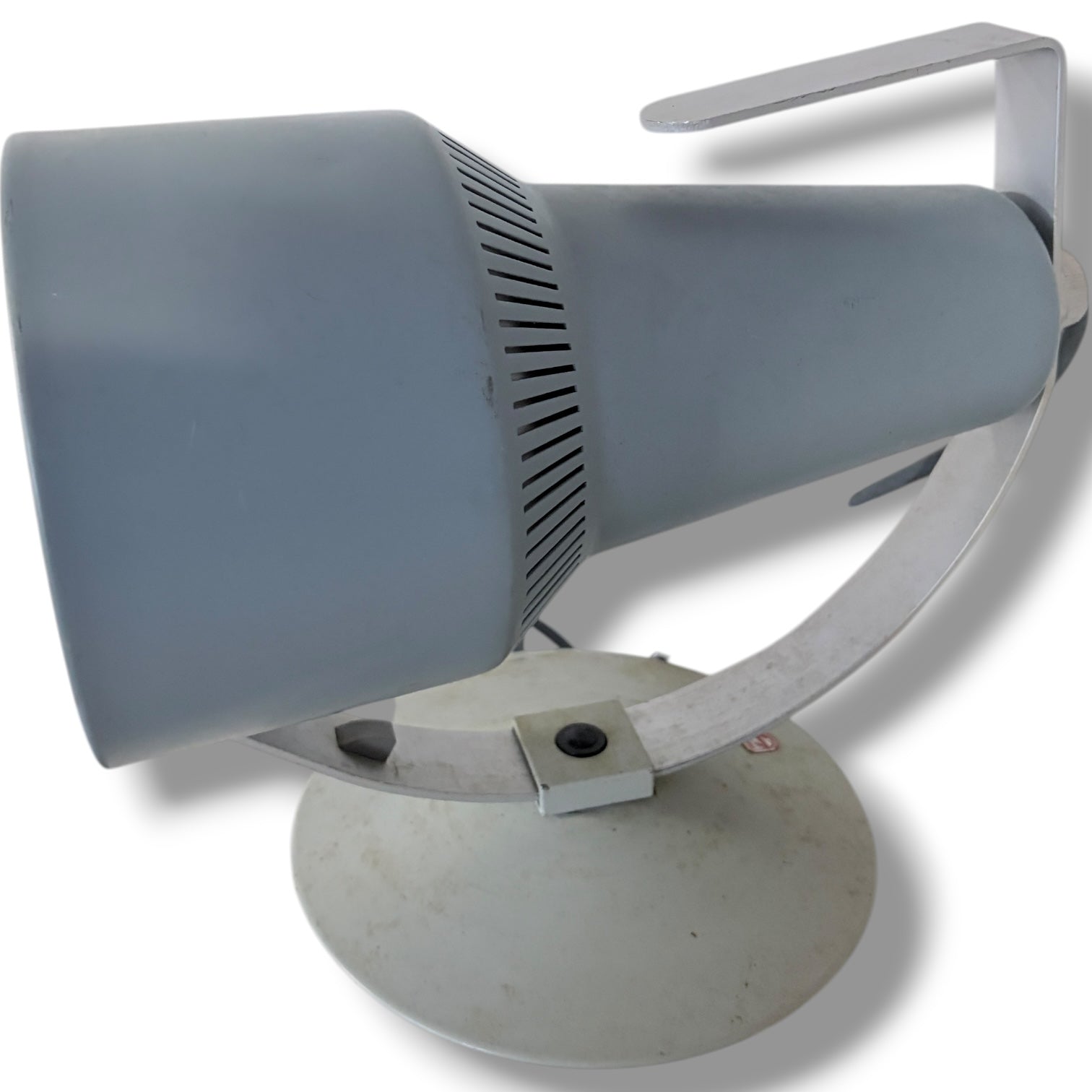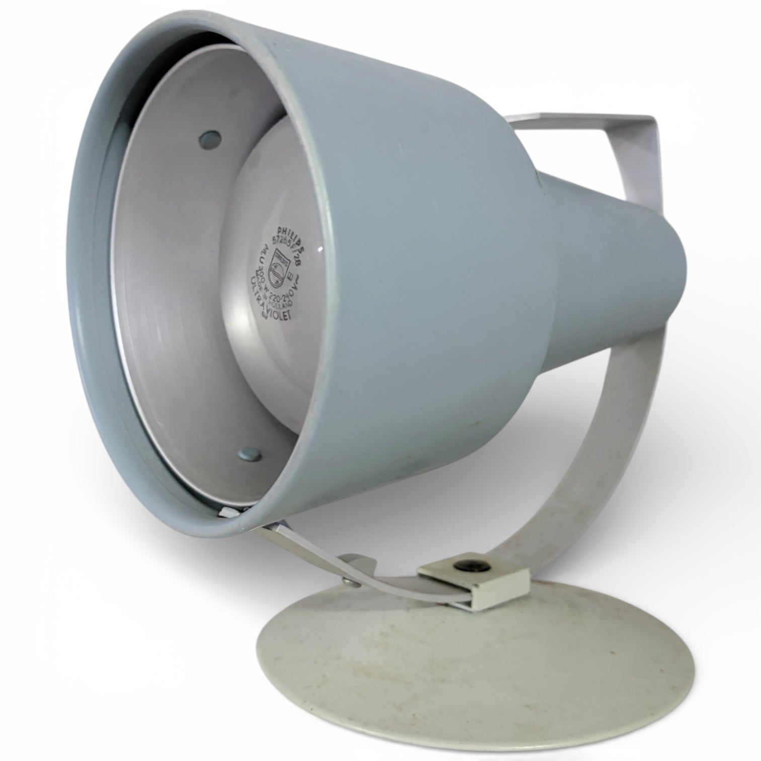 Crafted from painted metal with an aluminium support, this Philips vintage lamp showcases a soft grey/blue-grey tone that complements European vintage lighting collections. The adjustable directional head allows you to customize your lighting angle, enhancing productivity and reducing eye strain. Its weighted circular base ensures stability on any surface, making it an ideal sculptural desk light for modern interiors.