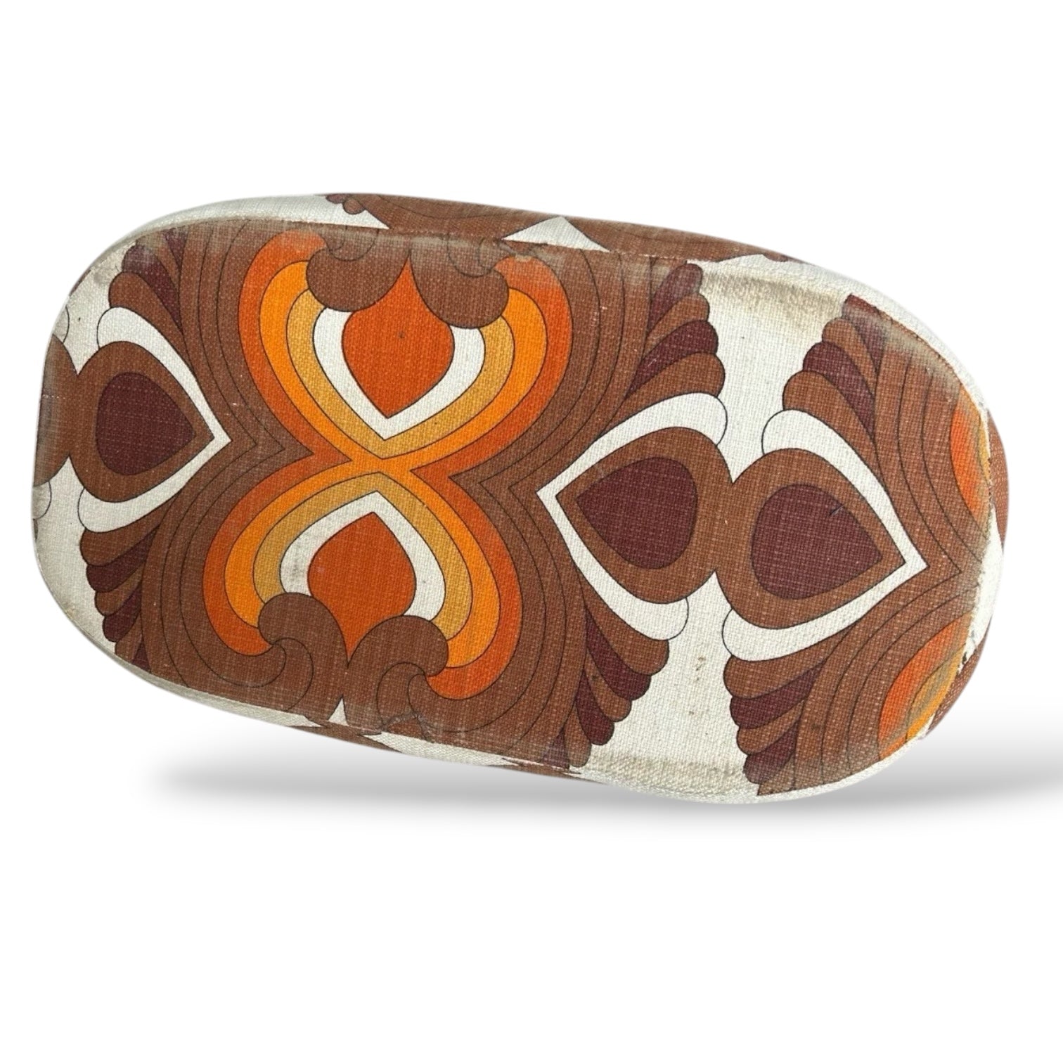 The fabric features bold psychedelic floral and geometric patterns in rich oranges, browns, and ochres, typical of the 1970s. Perfect as a nursery accent, playroom feature, or just a joyful decorative piece.