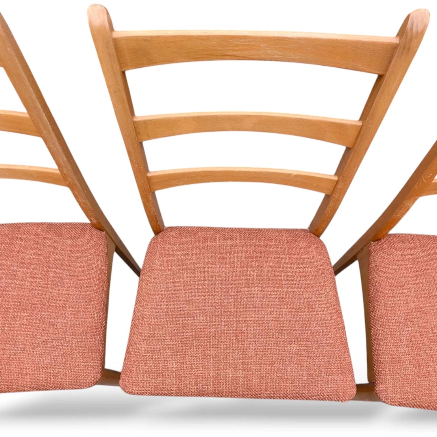 A charming set of four mid-century beech ladder back dining chairs, beautifully crafted with clean lines and timeless simplicity. These classic vintage chairs feature tapered legs and newly upholstered textured seat pads in a warm terracotta tone, offering both comfort and style.
