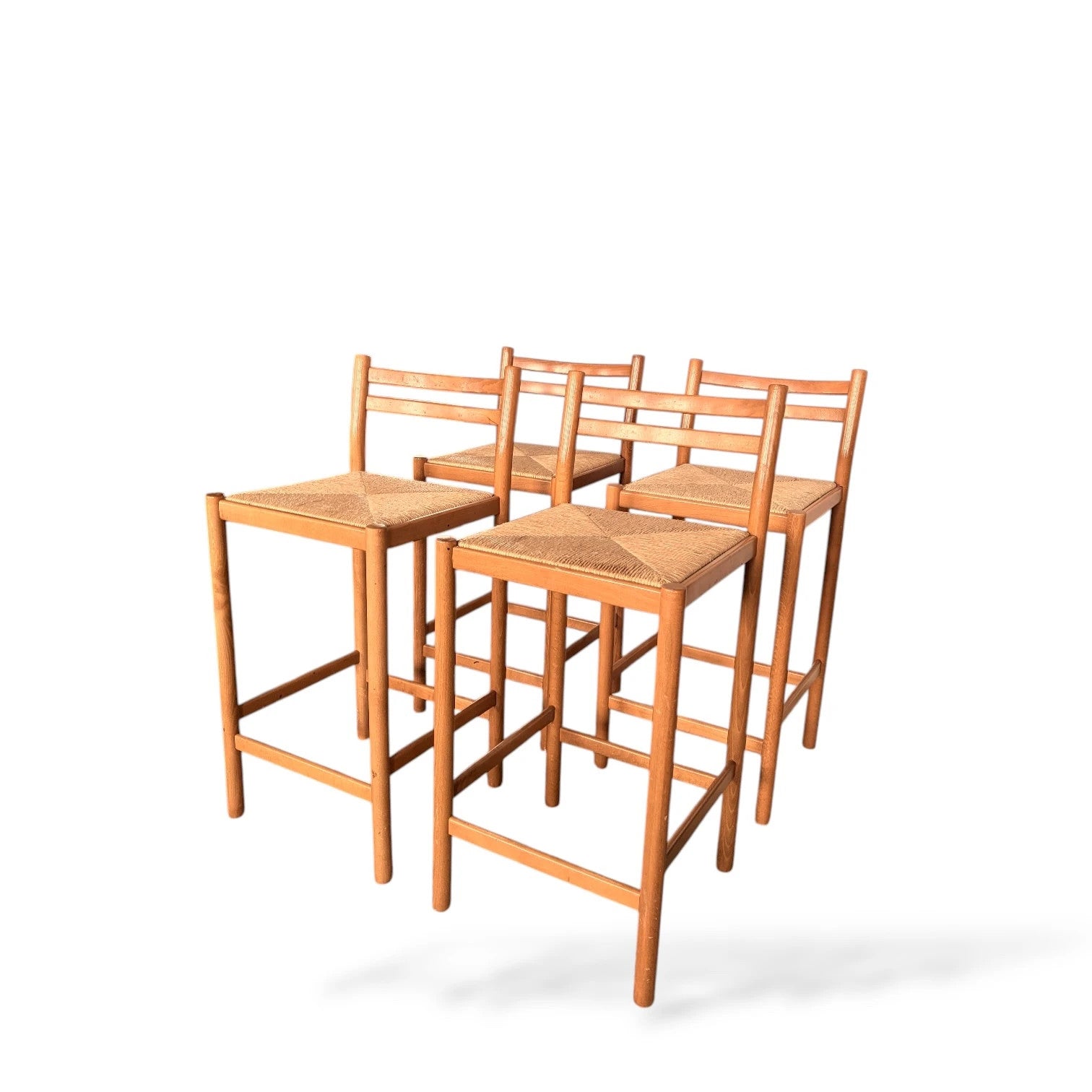 Set of 4 Mid-Century Beech & Rush Bar Stools – 1970s Habitat / Magistretti Style