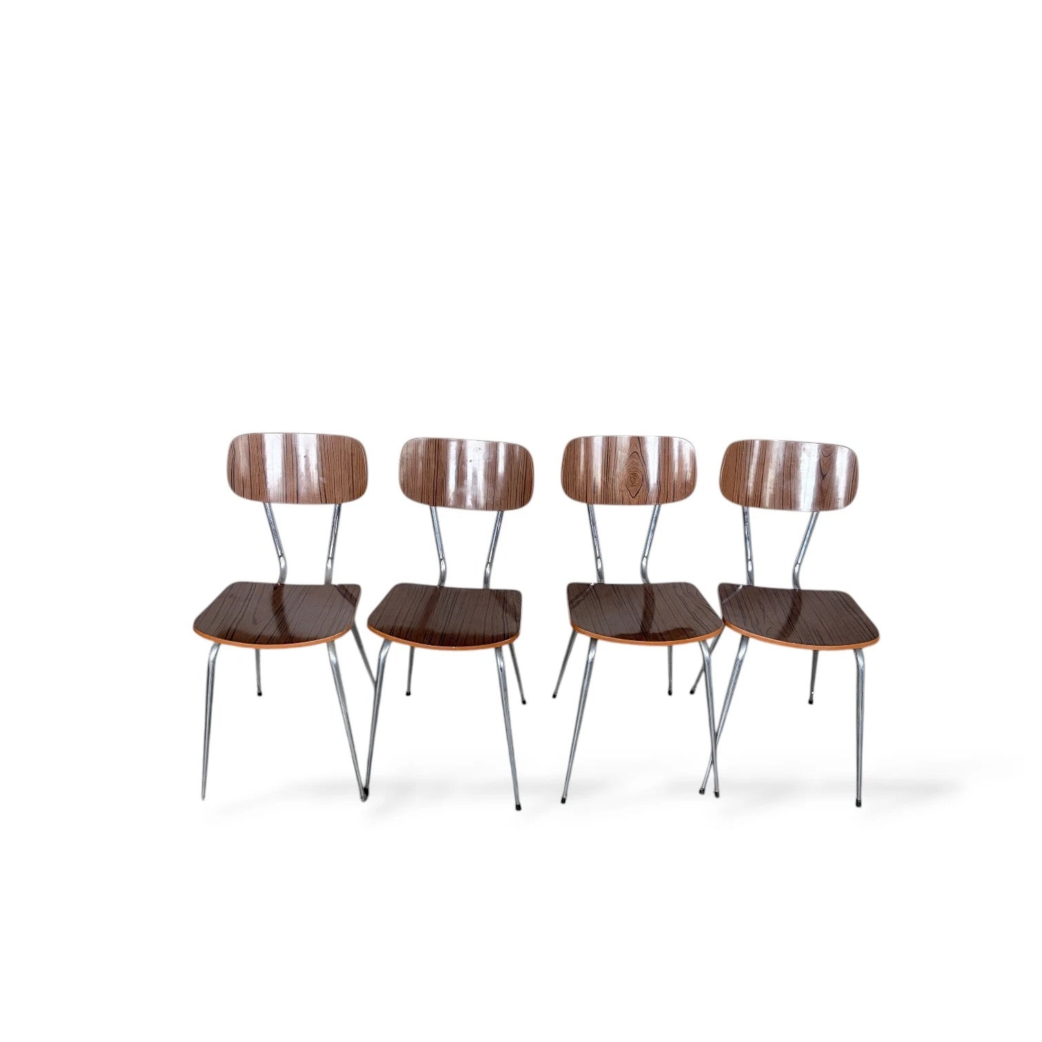 Set of Four Brown Formica Dining Chairs | Mid-Century Modern | Chrome Legs A sleek set of four vintage Formica dining chairs featuring gently curved plywood seats and backrests in a rich dark brown woodgrain finish, supported by chrome tubular legs. Perfect for dining, café, or studio settings — lightweight, durable, and stackable for easy storage. Their practical mid-century industrial design captures the era’s utilitarian charm while maintaining a warm, retro aesthetic. Dimensions: • Height: 60 cm • Seat Height: 48 cm • Depth: 37 cm Good vintage condition with light surface wear consistent with age.
