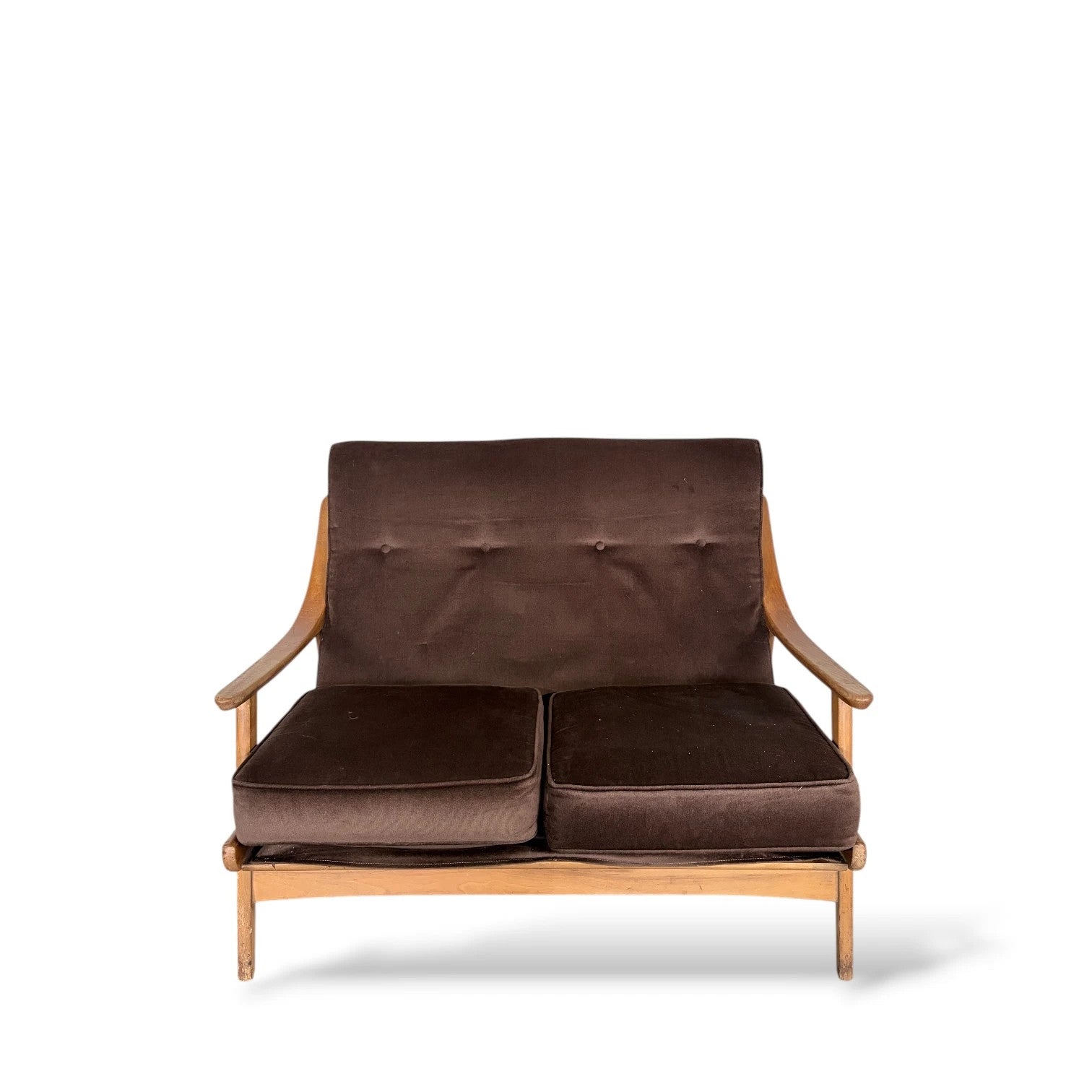 beautiful mid-century Swedish sofa with a solid beech frame and deep brown velvet upholstery. This two-seater captures the effortless simplicity of Scandinavian design — curved arms, clean lines, and a light, natural timber frame. The seat and back cushions provide comfort while maintaining that minimal, architectural profile so distinctive of Nordic furniture from the 1950s–60s. A versatile and elegant piece, perfect for smaller living spaces, reading corners, or as a statement in a contemporary interior. Details • Origin: Sweden • Period: Mid-century, circa 1960s • Materials: Beech wood frame, velvet upholstery • Condition: Good vintage condition with light age-related wear Dimensions • Width: 115 cm • Depth: 92 cm • Height: 84 cm Features • Sculpted beech frame with curved armrests • Deep brown velvet cushions • Compact and elegant form • True to Scandinavian modernist style Delivery & Collection • UK delivery available – please enquire for a quote • Collection welcome from West Yorkshire • See more at variusvintage