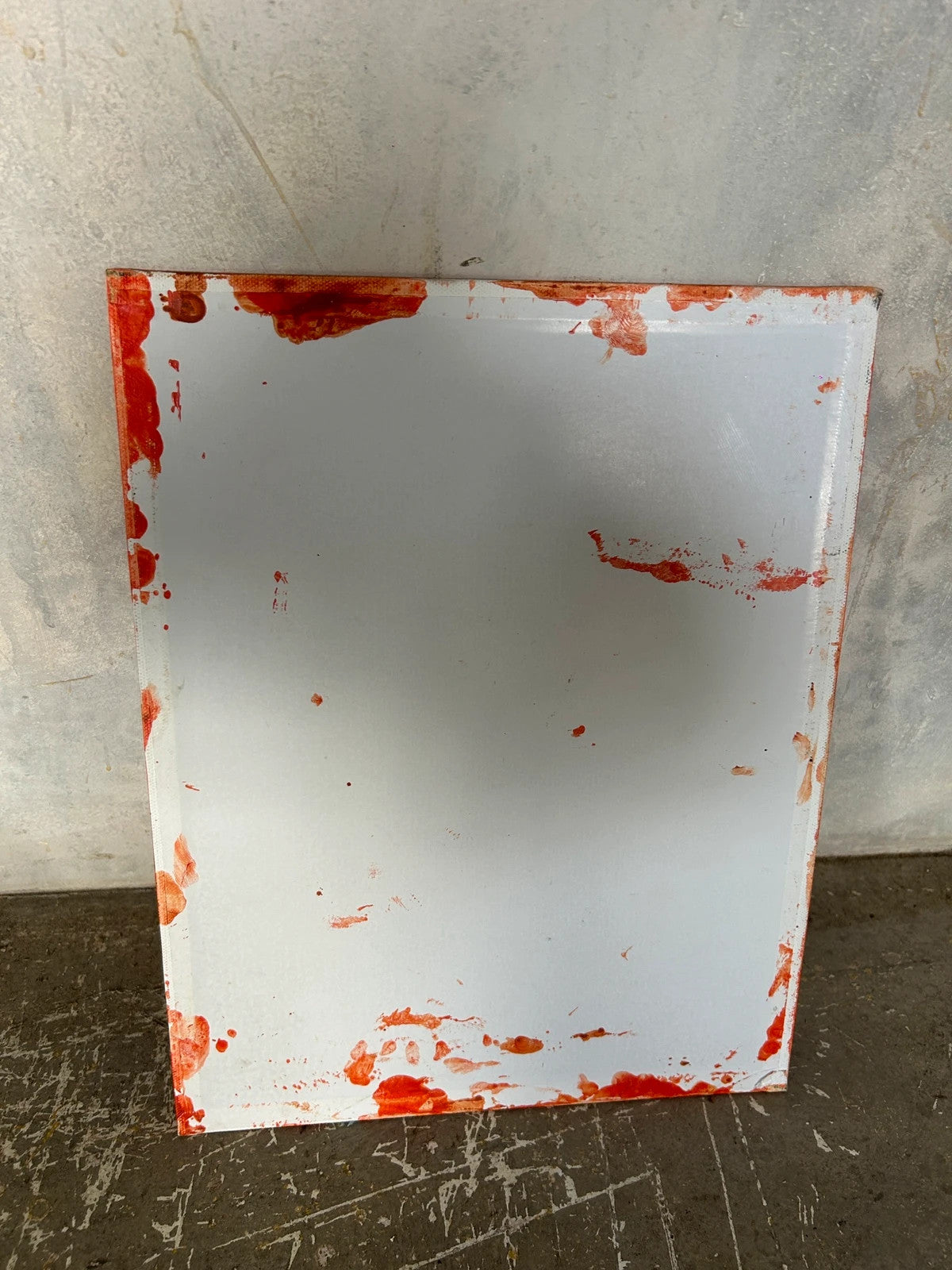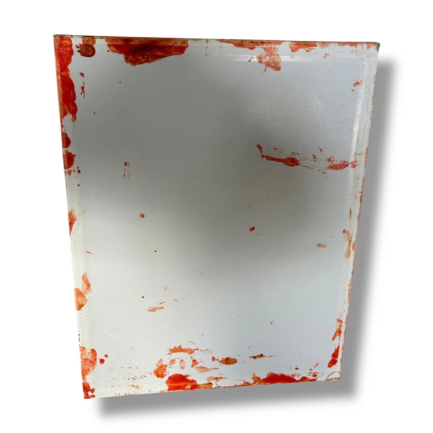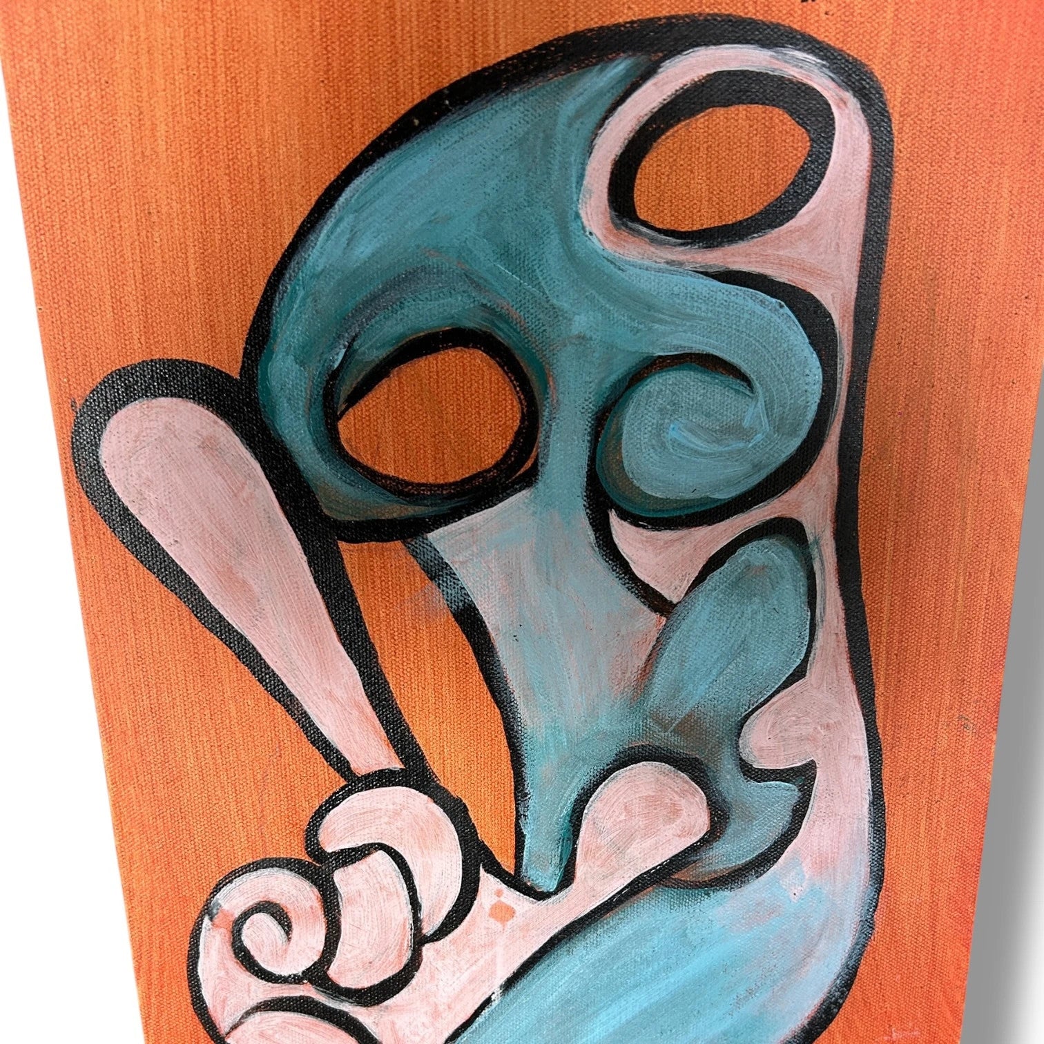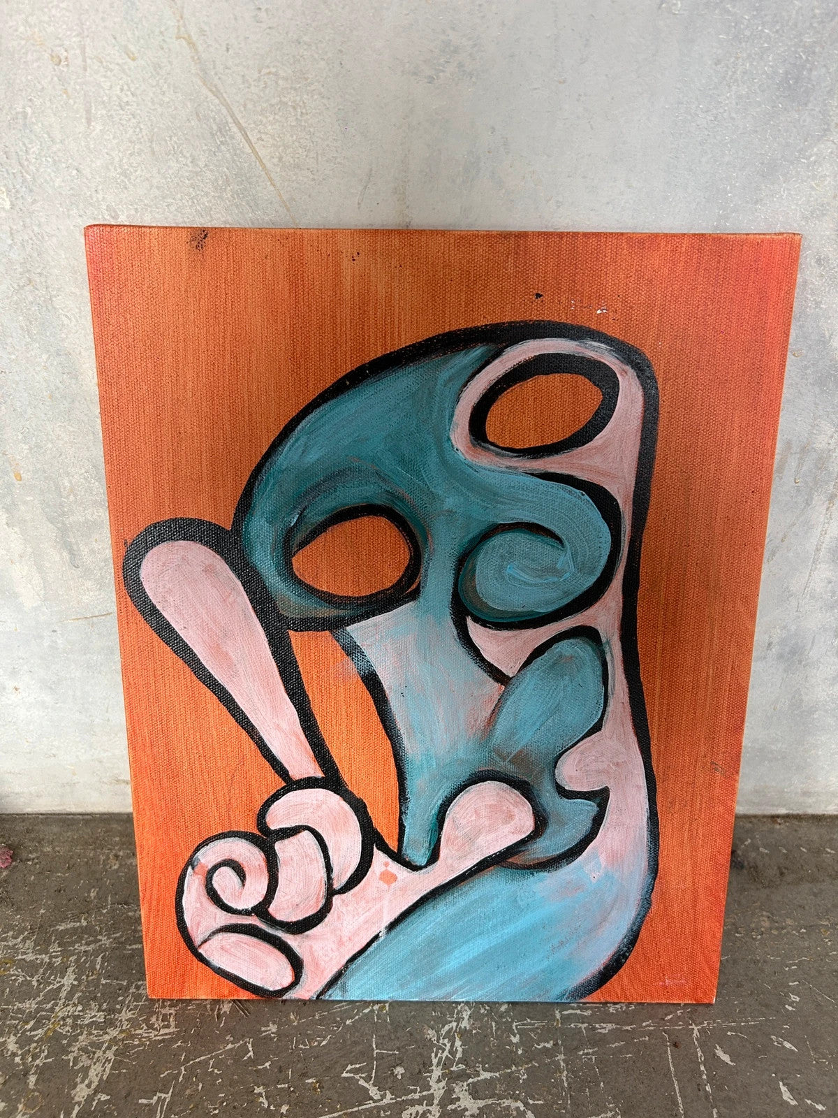 A bold and quirky vintage abstract painting featuring a stylised face with flowing forms in teal and pink, outlined in black against a warm orange background. The figure appears to be giving a peace sign, adding to the artwork’s playful and expressive character. This piece belongs to a series of unusual outsider art works, painted in a cartoon-meets-cubism style, perfect for collectors of the surreal, modernist, and offbeat.