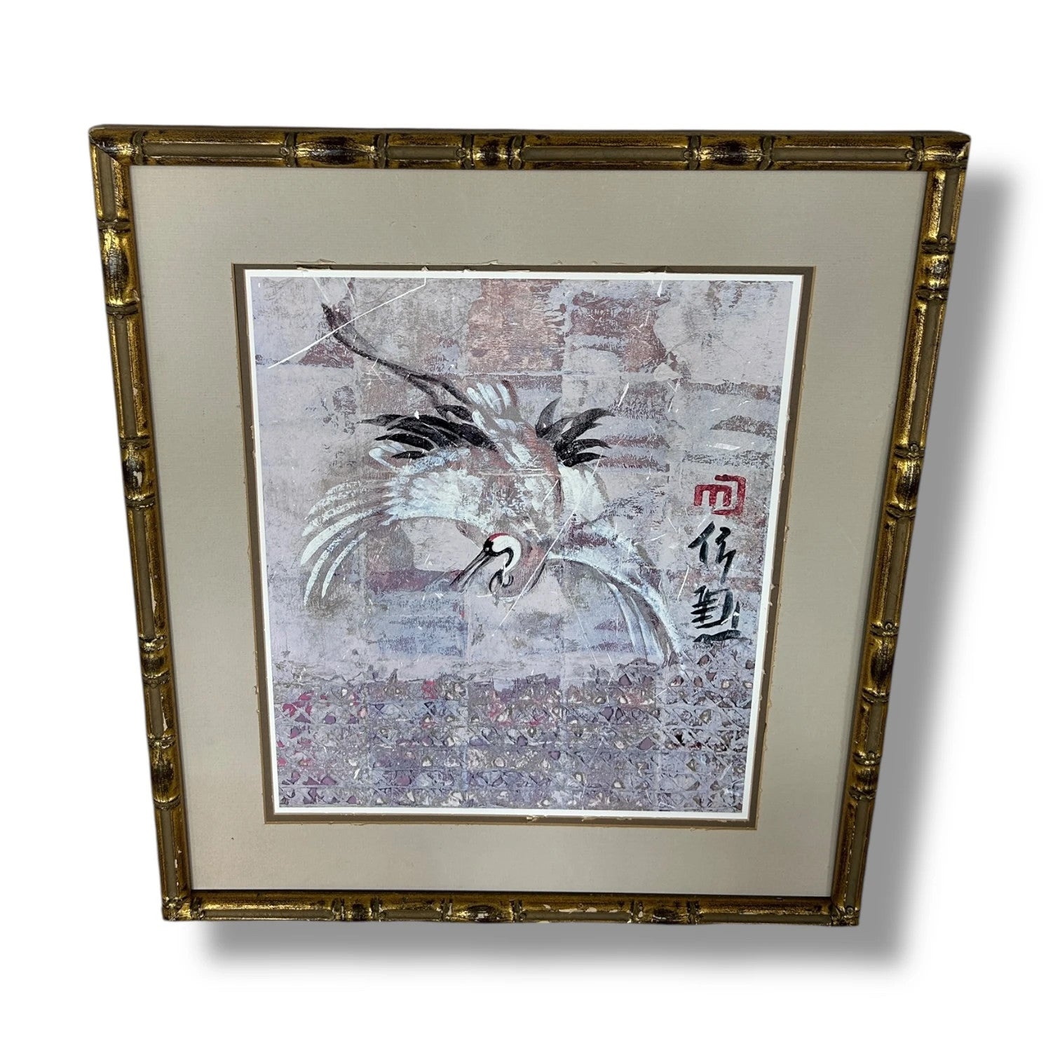 Vintage Bamboo Frame Wall Art – Crane Painting Print A striking vintage framed artwork featuring a graceful crane motif in an elegant bamboo-effect gilt frame. This piece combines Asian-inspired art with the timeless appeal of bamboo-style frames, perfect for a touch of chinoiserie elegance. • Artwork depicts a crane in flight, symbolizing longevity and peace • Set in a faux bamboo frame with gold finish • Subtle tones with oriental-style calligraphy detail • Mid to late 20th century wall decor • Ready to hang 📏 Dimensions: • Height: 69 cm • Width: 59 cm • Depth: 5 cm