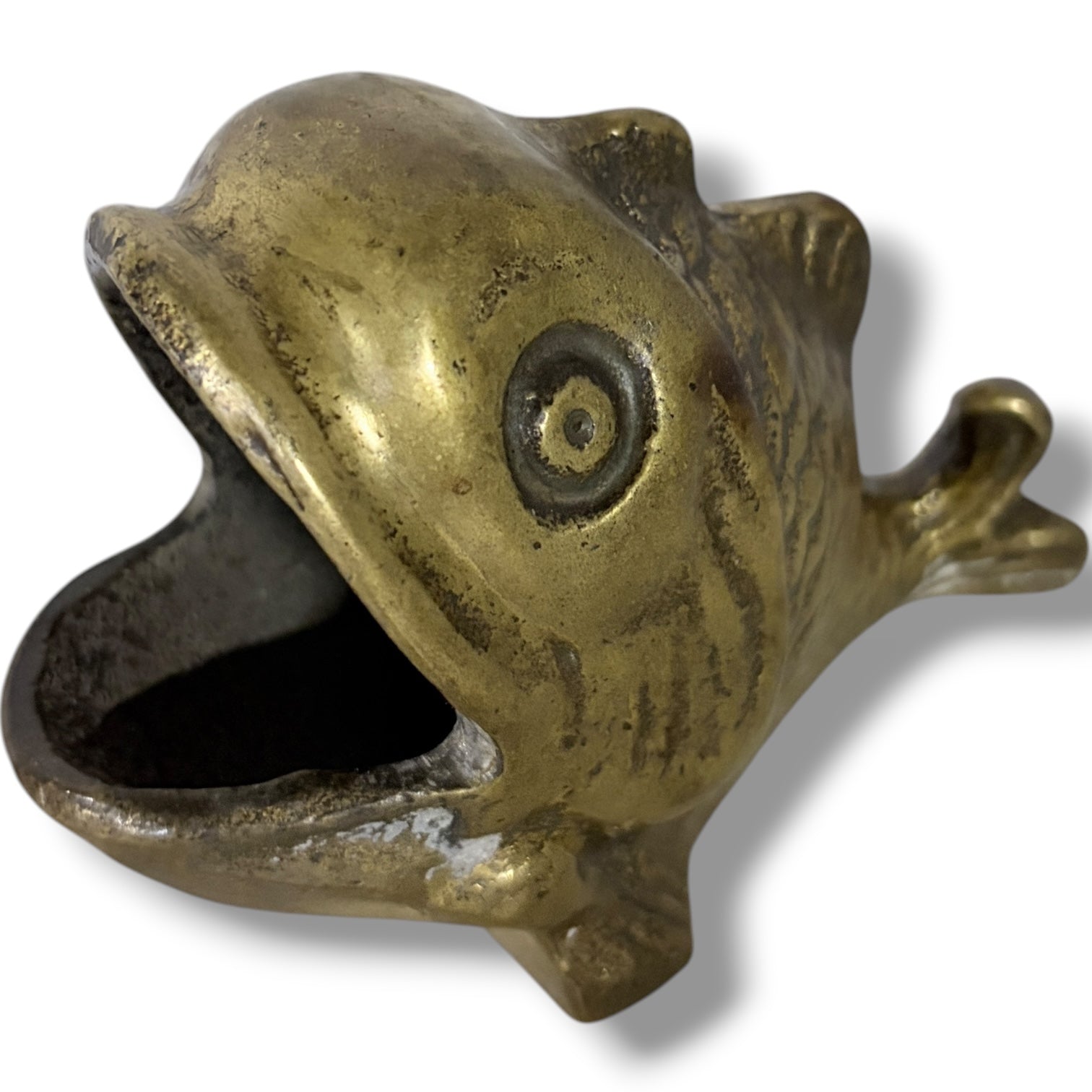 This vintage brass fish figurine is a small nautical decorative metal fish with an aged patina that captures the charm of coastal style figurines. Measuring approximately 4 inches long, this solid brass fish sculpture features a hollow interior accessed through its exaggerated open mouth, adding a surreal desk accessory vibe to your space. The vintage brass fish figurine offers a unique blend of retro home decoration and quirky paperweight gift potential, making it perfect for collectors of nautical decor items or anyone seeking a distinctive vintage fish ornament.
