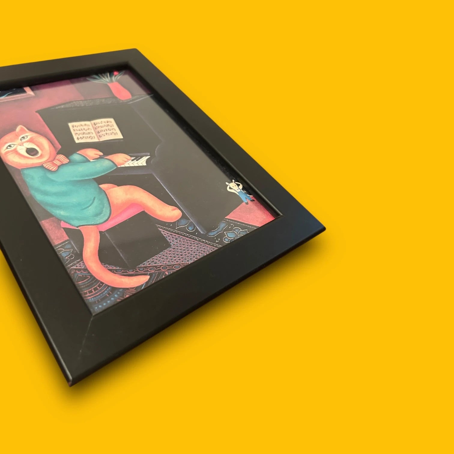Small a5 postcard size and framed in a simple black frame