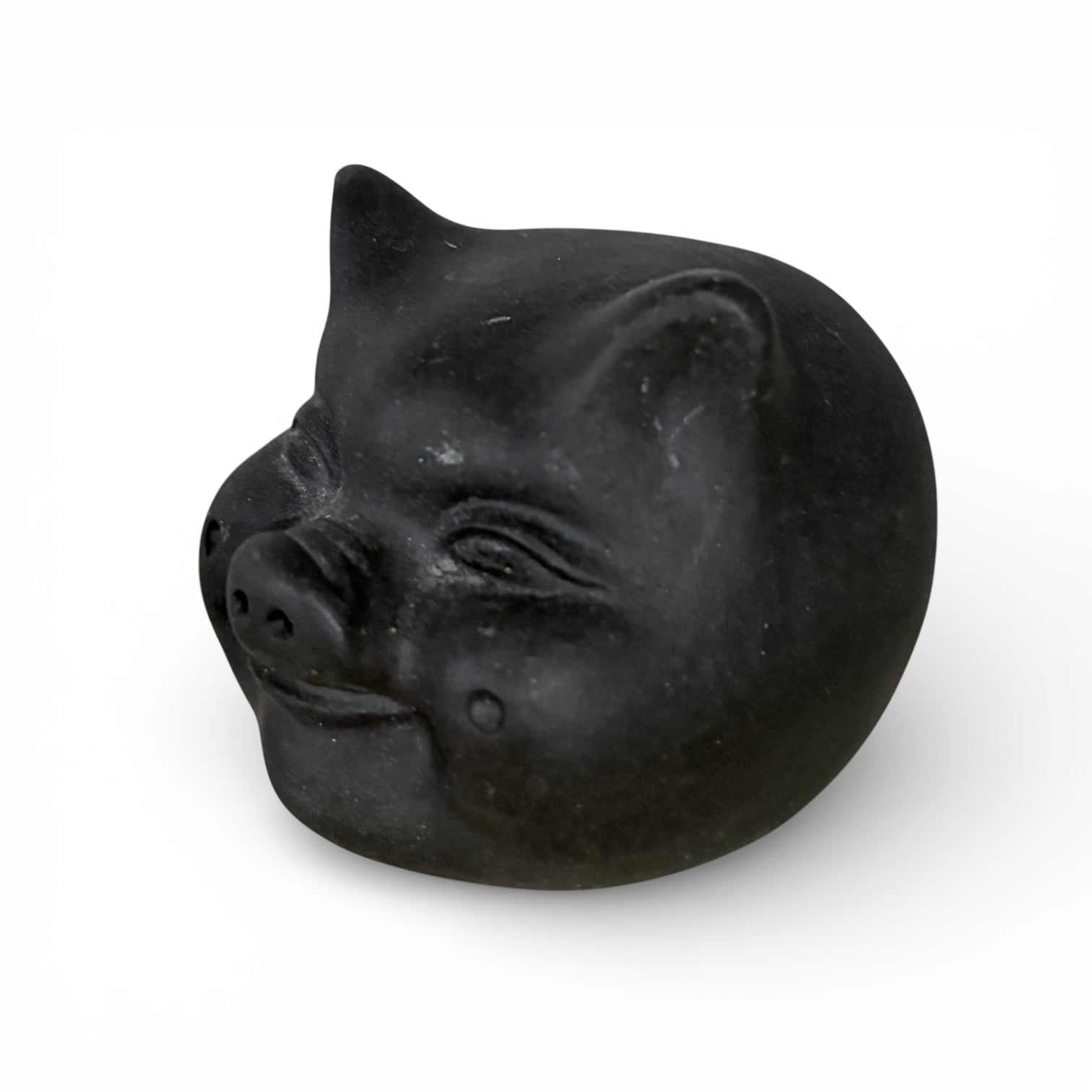 This vintage Chinese pig figurine is a charming black clay pottery sculpture designed as a happy face sculpture that doubles as a lucky pig rattle. Measuring 3.5 inches in height, 4 inches in width, and 4.5 inches in length, this handcrafted clay sculpture produces a soft sound when shaken thanks to discreet openings at the mouth. Traditionally used as a Chinese tea pet during tea ceremonies, it brings prosperity home decor appeal and joyful energy to any space.