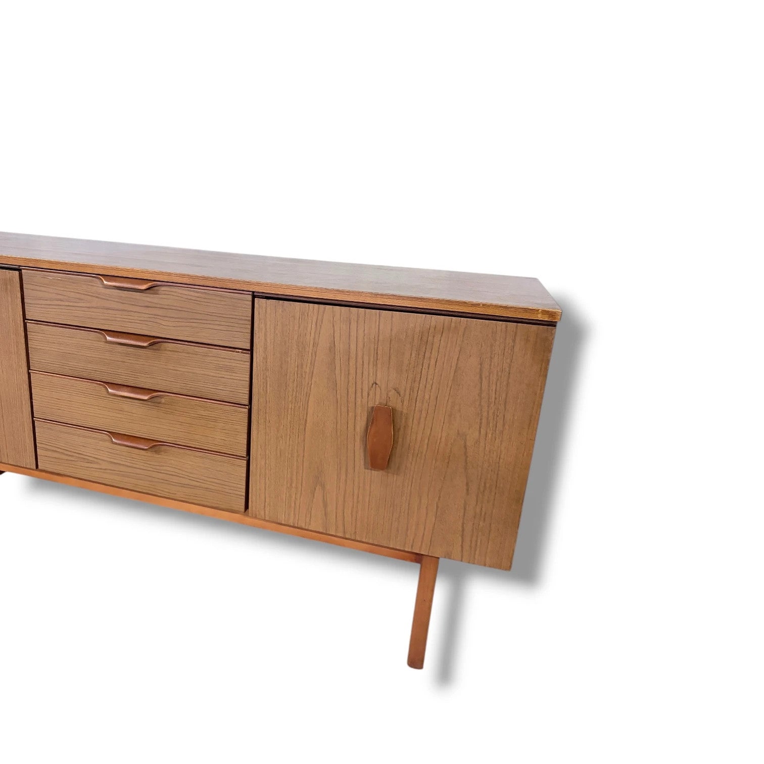 beautifully balanced vintage Europa sideboard, crafted in Britain during the 1970s. This piece features a teak-effect formica finish, solid wood handles, and classic mid-century lines that capture the clean, functional aesthetic of Scandinavian modern design. The sideboard offers ample storage, with four central drawers flanked by two spacious cupboards, each fitted with Europa’s distinctive curved teak handles. The practical formica surface is easy to maintain, making it ideal for everyday use while retaining a warm retro character. Perfect for use as a media console, hallway cabinet, or dining room sideboard. Details • Maker: Europa Furniture • Date: Circa 1970s • Style: Mid-Century Modern / Scandinavian • Material: Teak-effect formica with solid wood trim and handles • Colour: Warm teak tone • Condition: Excellent vintage condition; light surface wear consistent with age. Structurally sound and clean throughout. Dimensions • Width: 151 cm • Depth: 45 cm • Height: 75 cm Features • Four central drawers • Two cupboards with internal shelving • Sculpted teak handles • Durable and easy-clean formica top