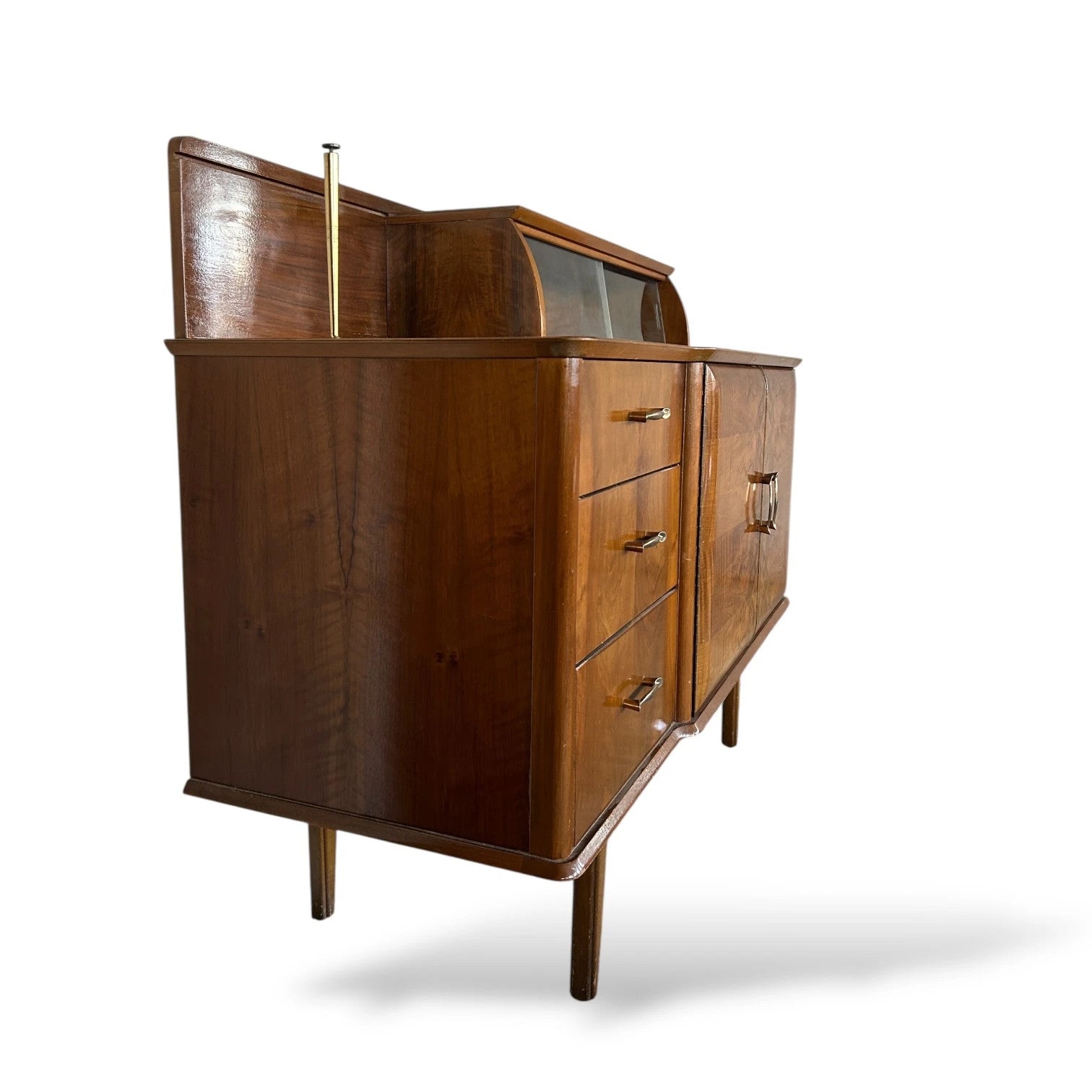Vintage Lebus Walnut Sideboard – Mid Century Modern Cabinet A striking vintage walnut sideboard by Lebus, dating from the mid-20th century. With beautiful walnut grain, sleek brass handles, and tapered legs, this piece combines both elegance and functionality. The sideboard features: • Three smooth-gliding drawers • A double-door cupboard for larger storage • Raised display shelf with glass sliding doors • Classic mid-century craftsmanship 📐 Dimensions: • Width: 125 cm • Height: 95 cm (to the top of the display) • Depth: 45 cm • Height to main surface: 75 cm ✨ Condition: Excellent vintage condition with light age-related wear. Sturdy, clean, and ready for use. 🏠 Style: • Mid-century modern storage • Vintage walnut furniture • Retro sideboard / cabinet