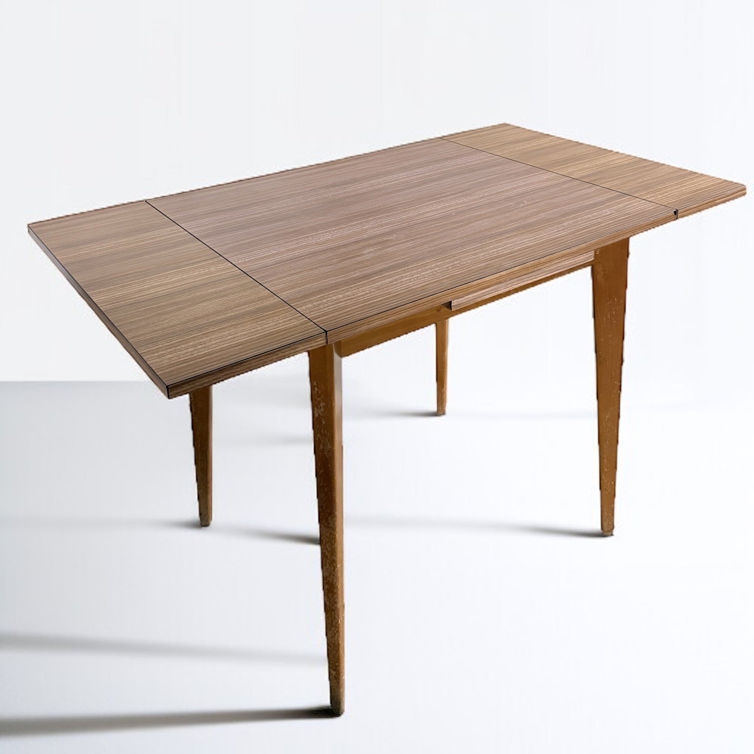 This vintage extending dining table offers a perfect blend of style and functionality for mid-century modern furniture lovers. Featuring a warm wood effect tabletop made from authentic Formica, this compact dining table expands effortlessly with a smooth pull out extension table mechanism, ideal for accommodating guests or creating extra workspace. Designed as a retro kitchen table, it delivers practical elegance with tapered wood legs and a timeless 1950s kitchen furniture aesthetic that enhances any small retro dining table setup or retro workspace desk.