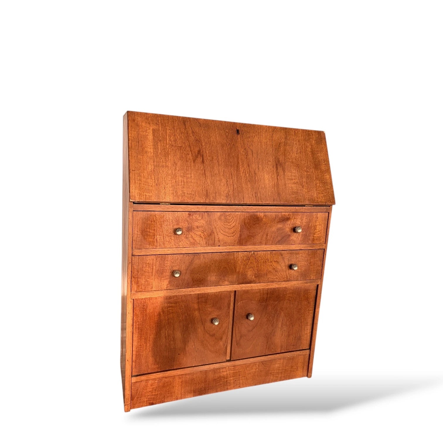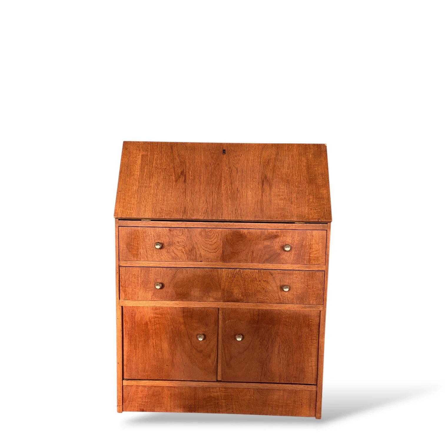 A charming mid-century slimline bureau in rich oak, dating from the 1960s–1970s. This beautifully proportioned piece offers a fold-down writing surface with generous internal storage, alongside three drawers and a two-door cabinet below. Its slim profile makes it perfect for smaller spaces, providing both form and function without compromising on style. The brass knob handles and subtle grain pattern highlight the understated elegance typical of mid-century British design. Ideal for use as a home office desk, writing bureau, or hallway organiser. Details • Date: Circa 1960s–1970s • Origin: United Kingdom • Style: Mid-Century Modern • Material: Oak and oak veneer with brass hardware • Condition: Excellent vintage condition; light wear consistent with age and use. Drop-down mechanism and drawers all function smoothly. Dimensions • Height: 99 cm • Width: 74 cm • Depth (closed): 18 cm • Depth (open): 58 cm Features • Compact and functional design • Drop-down writing surface • Three drawers and lower cupboard for storage • Solid brass knobs • Slimline profile ideal for apartments or home offices