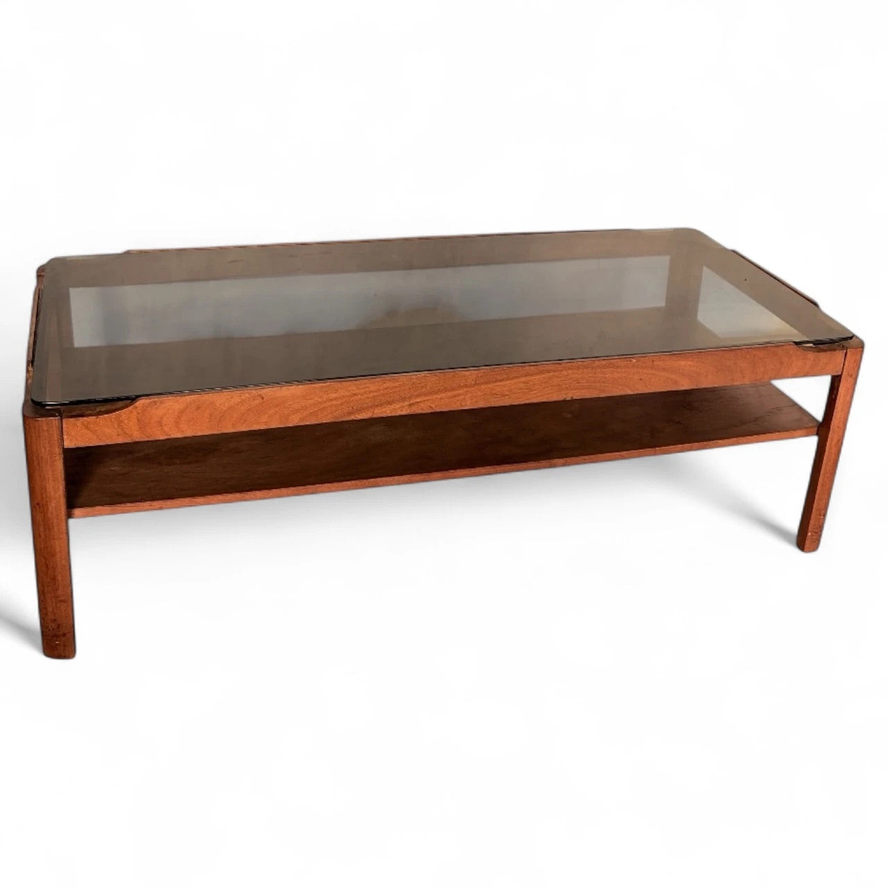 A stylish mid-century modern coffee table by Myers Furniture, dating from the 1970s. This elegant design features a smoked glass top set within a solid teak frame, complemented by a lower shelf for magazines or storage. The minimal, functional form and warm wood tones make it a perfect addition to any mid-century or contemporary interior. The table’s combination of smoked glass and teak reflects the era’s love of modern materials and craftsmanship — an understated yet iconic design ideal for living rooms, lounges, or offices. Details • Maker: Myers Furniture • Date: Circa 1970s • Style: Mid-Century Modern / British Modern • Materials: Teak, smoked glass • Condition: Very good vintage condition with light wear consistent with age; glass free from cracks or chips. Dimensions • Width: 110 cm • Depth: 48 cm • Height: 38 cm Features • Smoked glass tabletop with inset design • Solid teak frame with elegant joinery • Integrated lower shelf for books or magazines • Clean mid-century modern lines • Ideal for living rooms or modern lounges