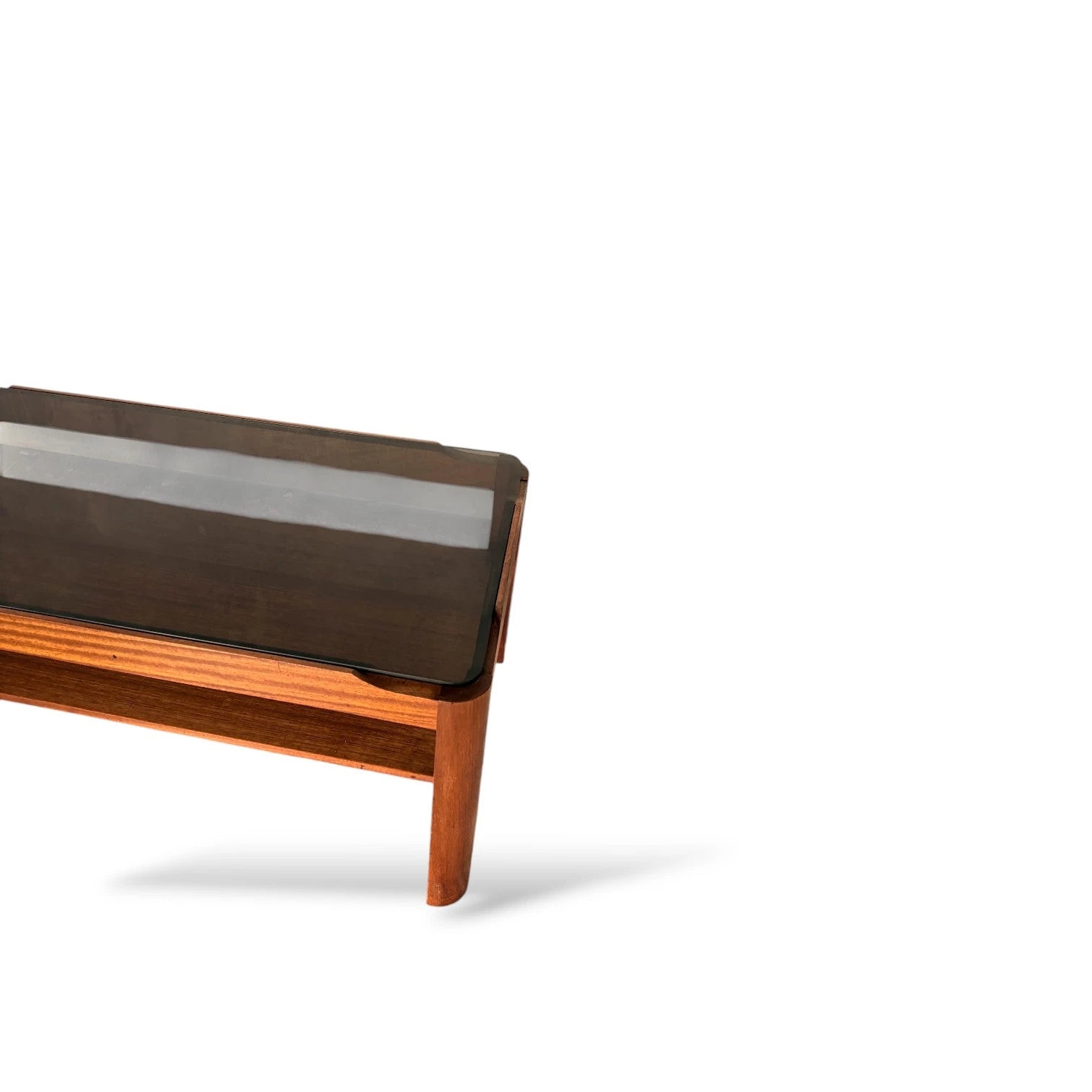A beautifully designed small smoked glass coffee table by Myers Furniture, made in the 1970s. This elegant mid-century piece features a smoked glass top framed in solid teak, with a practical lower shelf for books or magazines. Compact yet refined, this table is perfect for smaller spaces, apartments, or as an additional occasional table to pair with a larger Myers design. The rich teak tones and clean, modernist lines make it a perfect accent for both contemporary and retro interiors. Details • Maker: Myers Furniture • Date: Circa 1970s • Style: Mid-Century Modern / British Modern • Materials: Teak, smoked glass • Condition: Very good vintage condition with light wear consistent with age; glass clear with no cracks or major scratches. Dimensions • Width: 88 cm • Depth: 44 cm • Height: 36 cm Features • Elegant smoked glass top • Teak frame with warm patina • Lower shelf for practical storage • Compact and versatile size • Classic mid-century design with a modern appeal