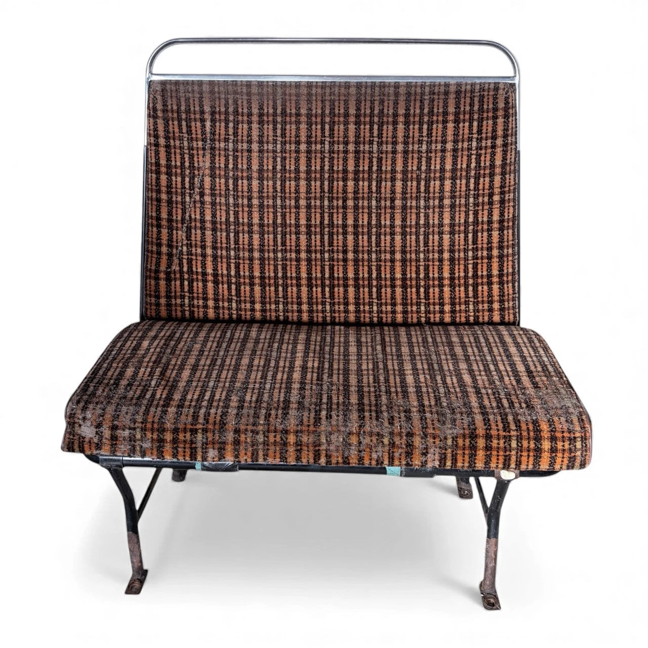 rare and characterful vintage bus seat, salvaged from a mid-century British coach. This industrial-style piece features the original orange and brown check wool upholstery, set on a sturdy black metal frame with chrome detailing. Perfectly balanced between nostalgia and functionality, it’s an ideal statement piece for use as a quirky hallway bench, café seat, or industrial accent chair. Its original patina and wear tell the story of countless journeys, giving it that sought-after authentic charm. ⸻ Details • Origin: UK, mid-20th century • Material: Wool-blend upholstery, chrome + painted steel frame • Condition: Vintage condition with patina, wear, and age-appropriate signs of use • Features: Check patterned upholstery, original chrome rail, solid industrial frame ⸻ Dimensions • Width: 83 cm • Depth: 56 cm • Height: 92 cm • Seat Height: 40 cm ⸻ Styling Notes A playful statement seat with serious retro credentials — perfect for loft apartments, cafés, home bars, or eclectic interiors. Style alongside mid-century lighting, vintage signage, or reclaimed wood for a nostalgic industrial look. ⸻ Delivery & Collection • UK delivery available – please enquire for a quote • Collection welcome from West Yorkshire • Find more authentic industrial and mid-century pieces at variusvintage