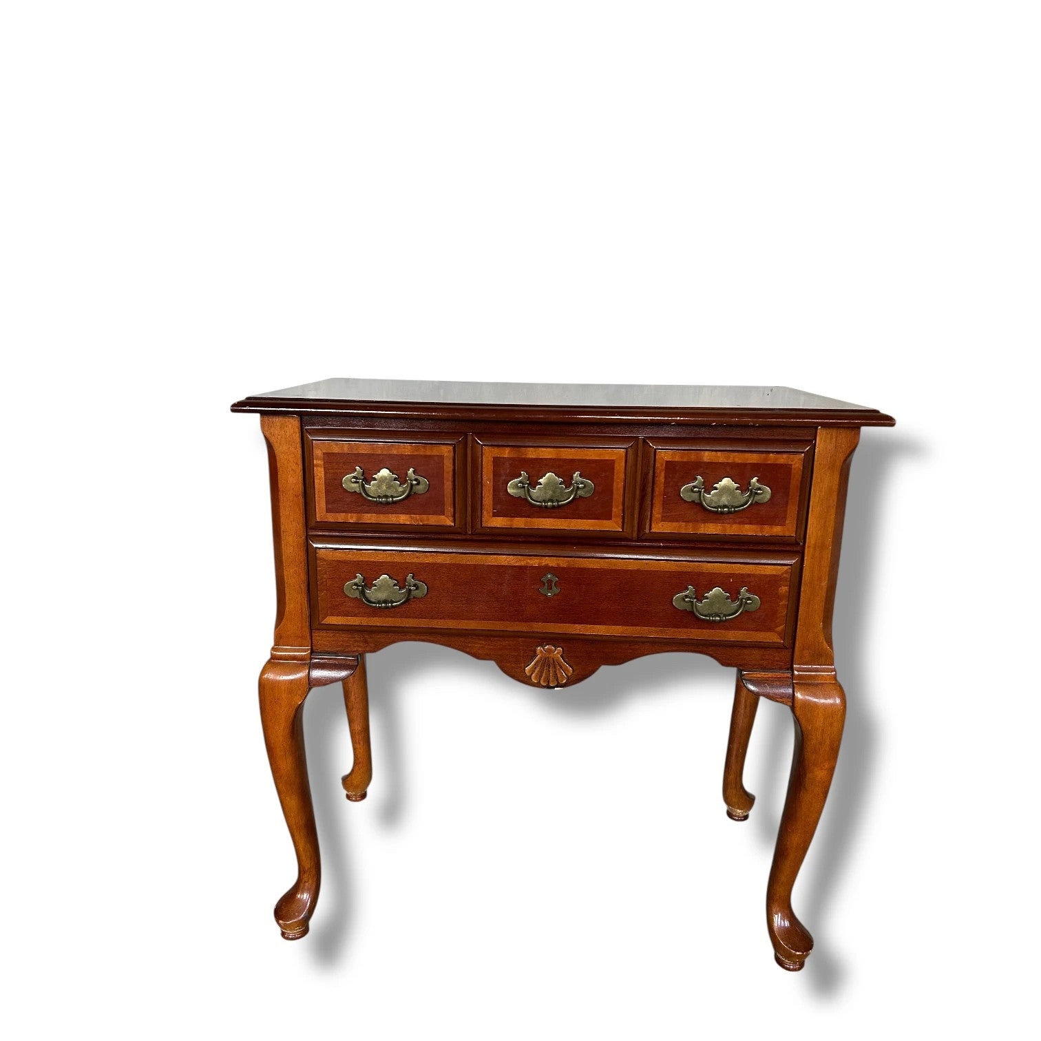 A charming Queen Anne style cabinet with two spacious drawers, featuring elegant cabriole legs and brass handles. The front is finished with marquetry inlay detailing, adding depth and character to this timeless piece. Perfect as a hallway cabinet, side table, or bedside storage, this piece combines practicality with period charm. ✨ Features: • Queen Anne style • Two drawers with brass handles • Cabriole legs with shell motif detail • Decorative marquetry inlay • Warm rich wood tone 📏 Dimensions: Height: 77cm Width: 74cm Depth: 42cm This versatile piece works beautifully in both traditional and eclectic interiors, offering useful storage with an elegant design.
